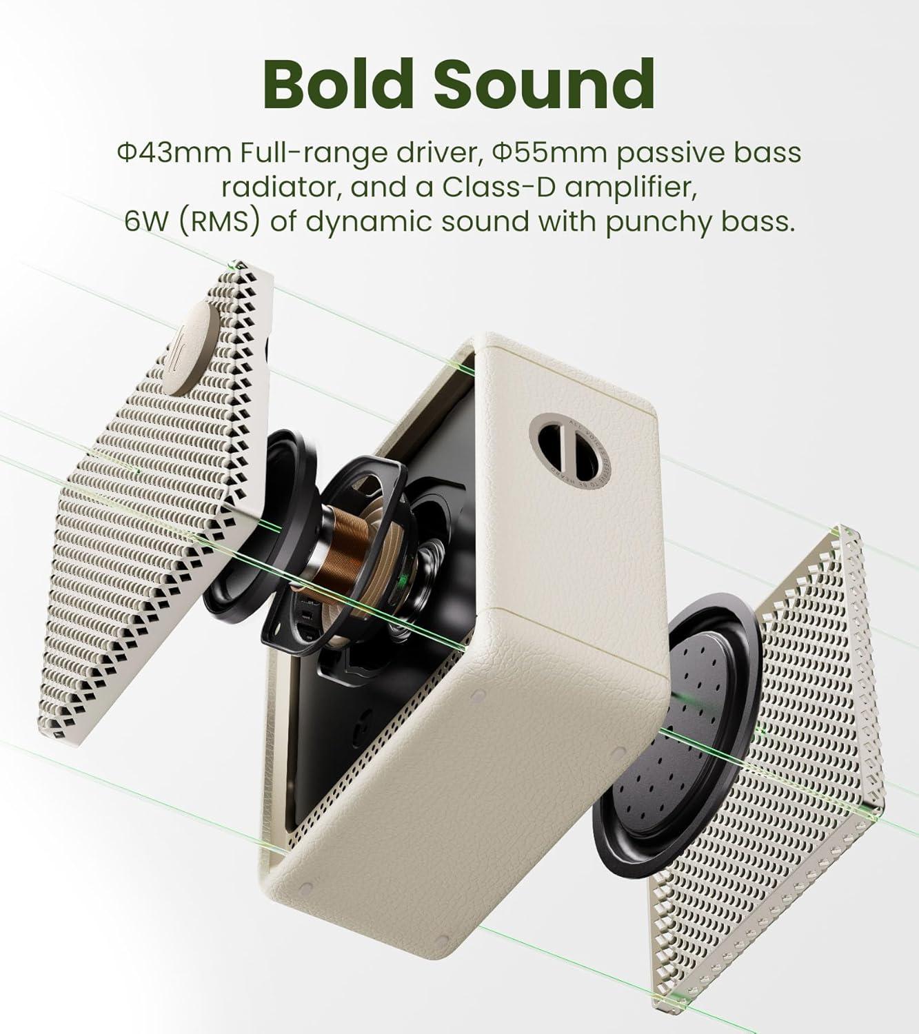 PREMIUM SOUND QUALITY – Experience rich, immersive audio with 6W (RMS) output power and a 1.7'' (43mm) full-range driver enhanced by 2'' passive bass radiators. It delivers a rich, punchy sound with deep lows and crisp highs. Perfect for music lovers who demand high-quality sound in a compact, portable design.