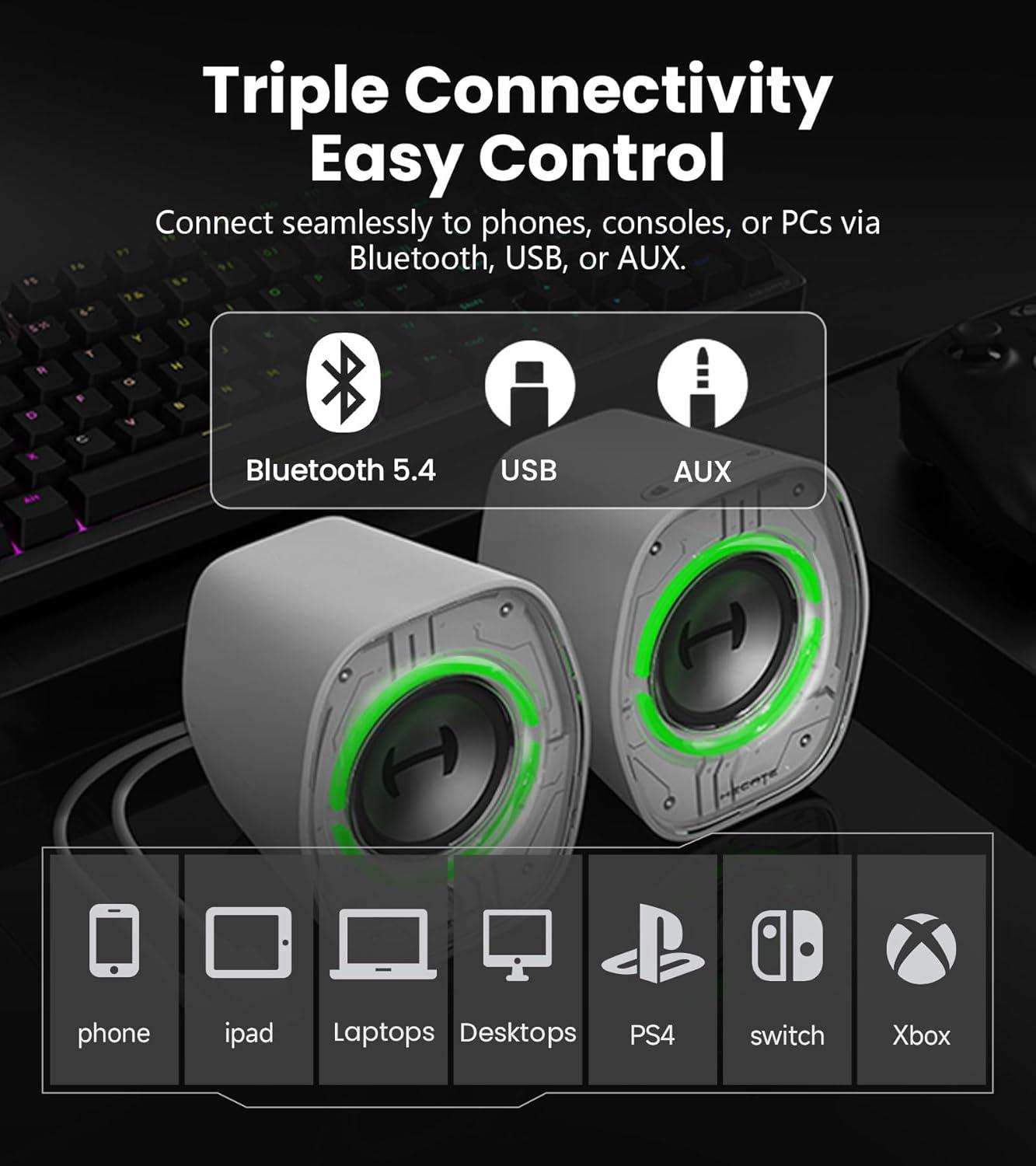 Triple Connectivity & Universal Compatibility: Seamlessly connect via Bluetooth 5.4 (≤40ms low latency), USB-C/USB-A, or 3.5mm AUX. Perfect for PC, laptops, PS5, Switch, Xbox and tablets – ideal computer speakers for desktop pc setups