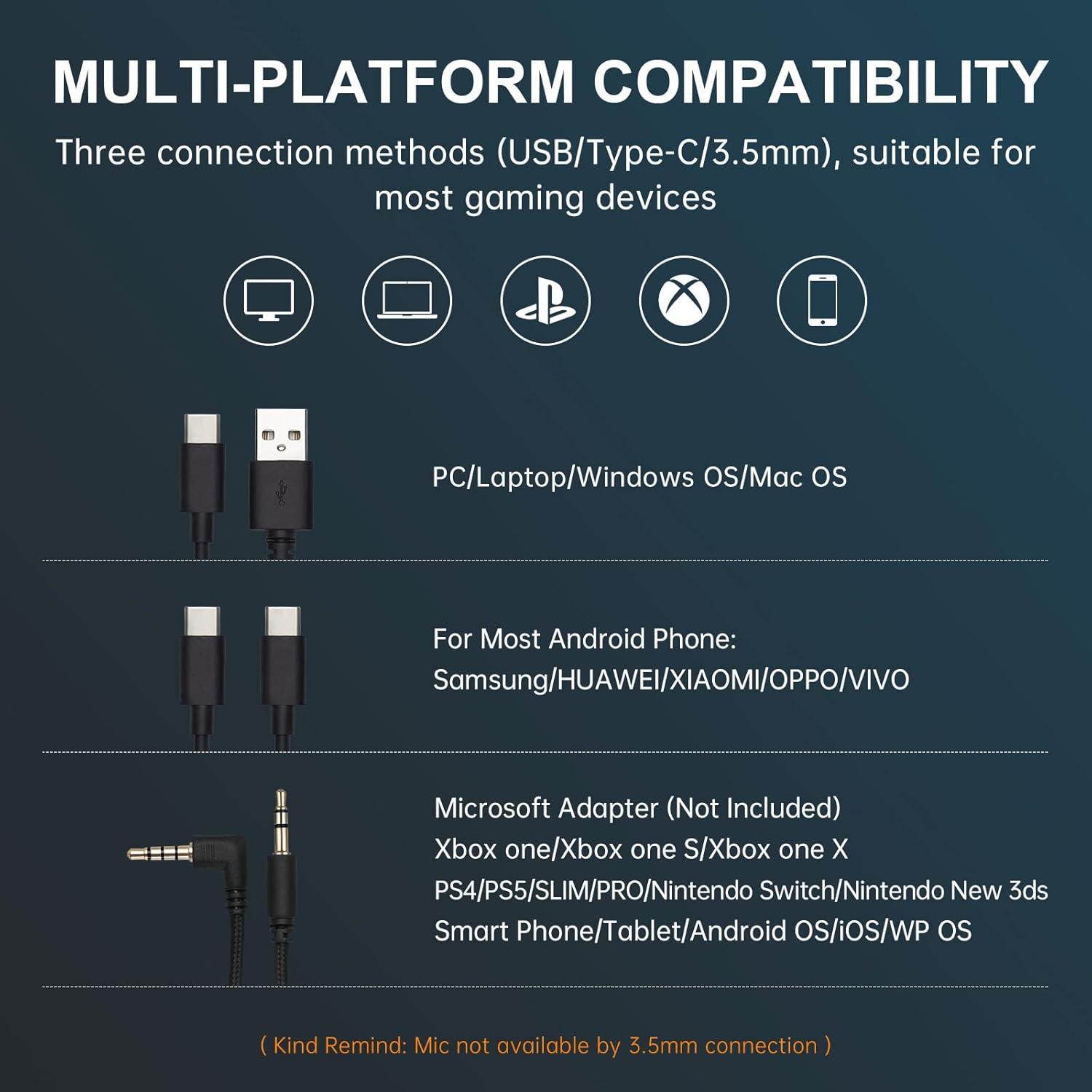 Multi-Platform Compatibility¡¿ With a type C/USB/3.5MM audio jack, these headsets compatible with PC, Laptop, Pad, Smart Phone, PS4, PS5, Nintendo Switch, Xbox Gamepad(3.5mm) and other gaming devices.