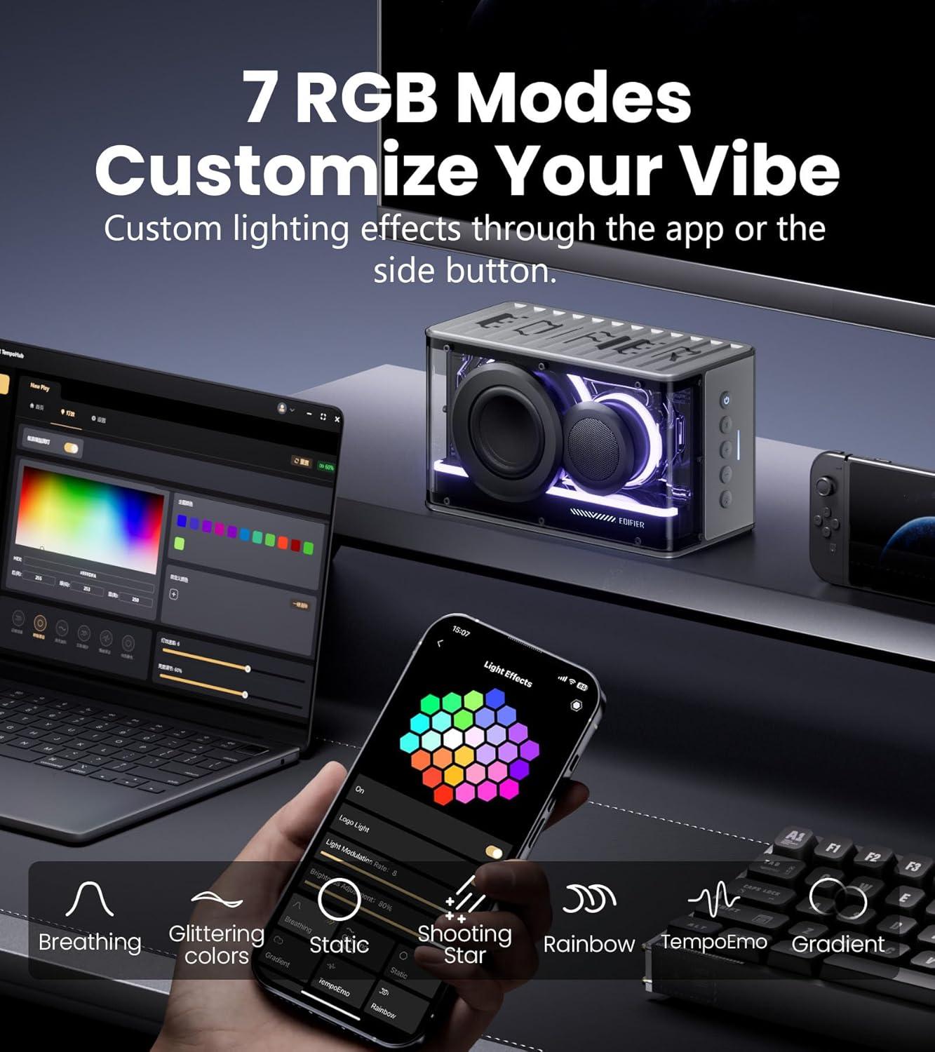Immersive RGB Lighting:Features 7 preset RGB lighting effects and audio sync function. The lights dance to the music rhythm. Customize unique color combinations via the App to elevate your audio-visual experience.​