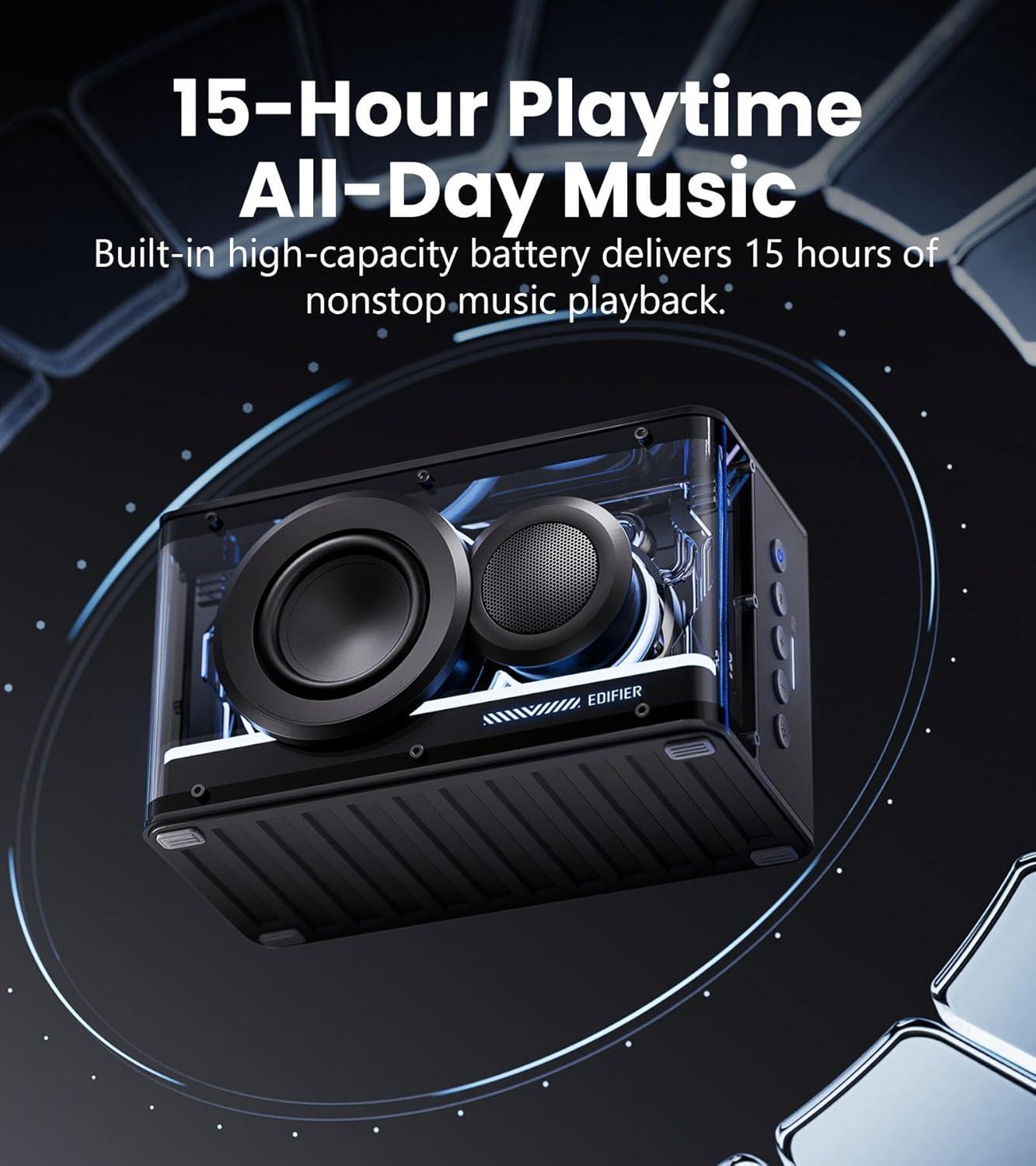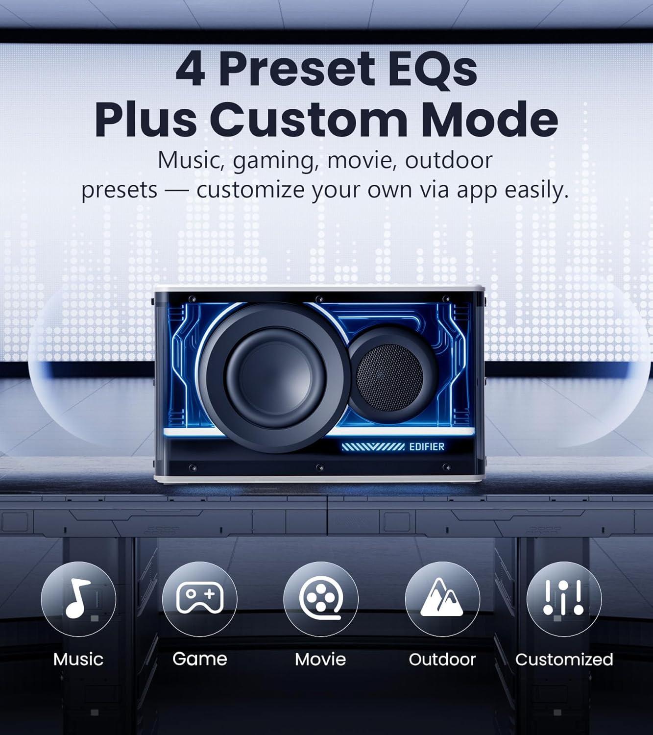 4 Preset + Custom Sound Profiles:Comes with 4 preset sound modes – Music, Game, Movie, and Outdoor. Game mode enhances bass and sound effects; Movie mode improves dialogue clarity. Custom EQ via EDIFIER ConneX (mobile)/TempoHub (computer) App for personalized sound.​