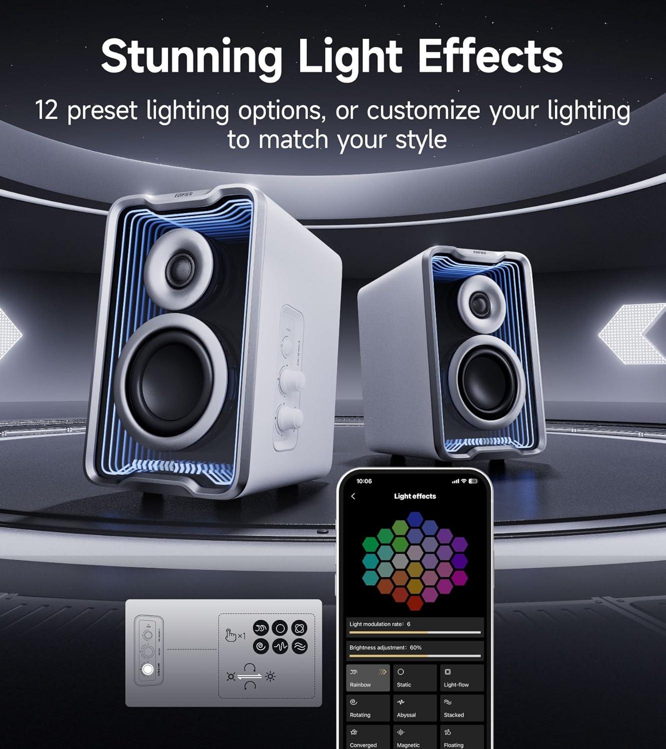 imageEdifier QR30 20 Desktop Active Speaker Compact Bluetooth V54 Computer Speakers Wireless Bookshelf Speaker 30W RMS 35mm AUX ampamp USBA Wired Input Dynamic Light Effects App Control WhiteBlack