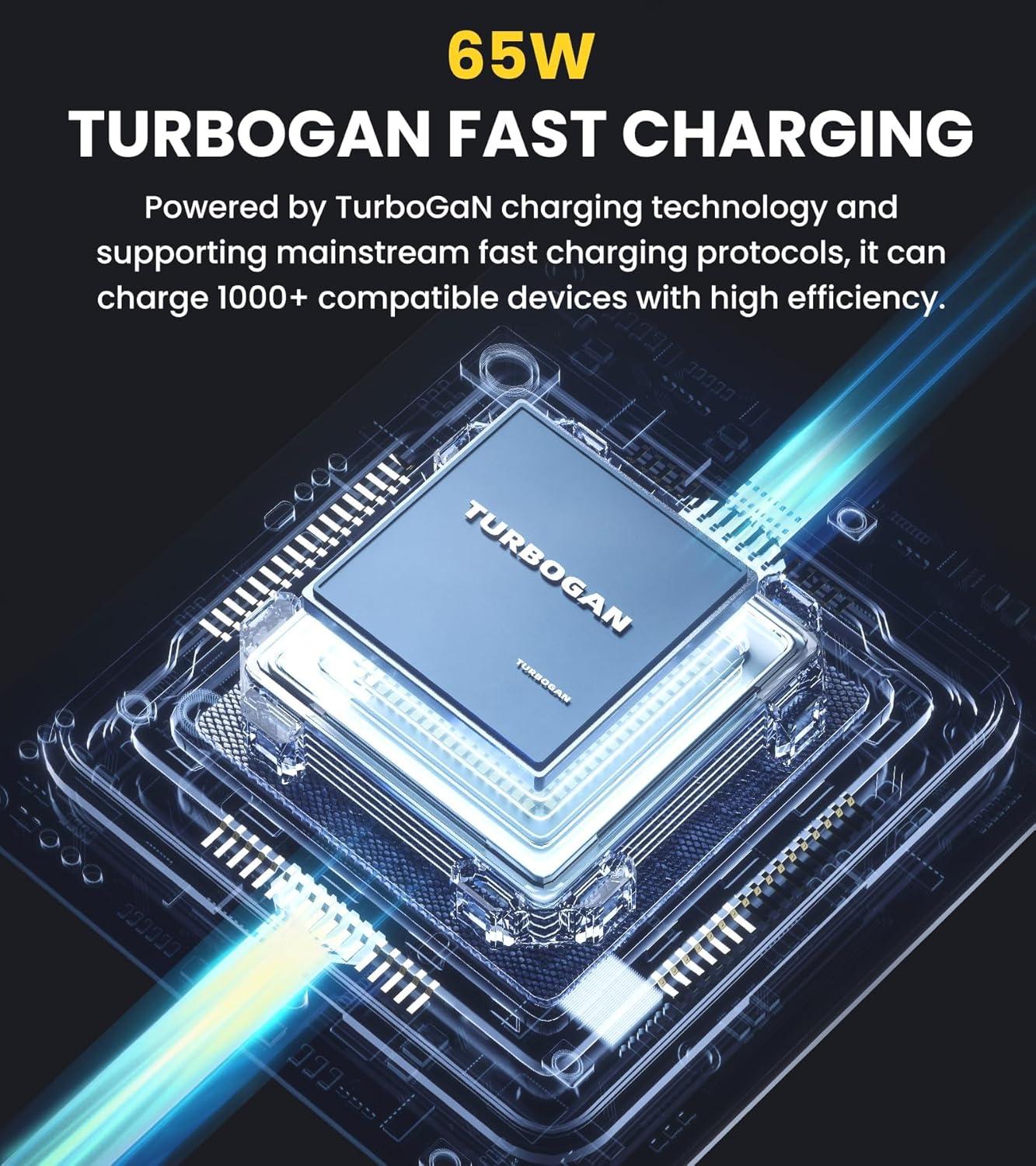 [65W TurboGan Fast Charging] Each USB Type-C port provides a maximum power capacity of 65W for charging. Powered by TurboGaN charging technology and supporting mainstream fast charging protocols, it can charge 1000+ compatible devices with high efficiency.