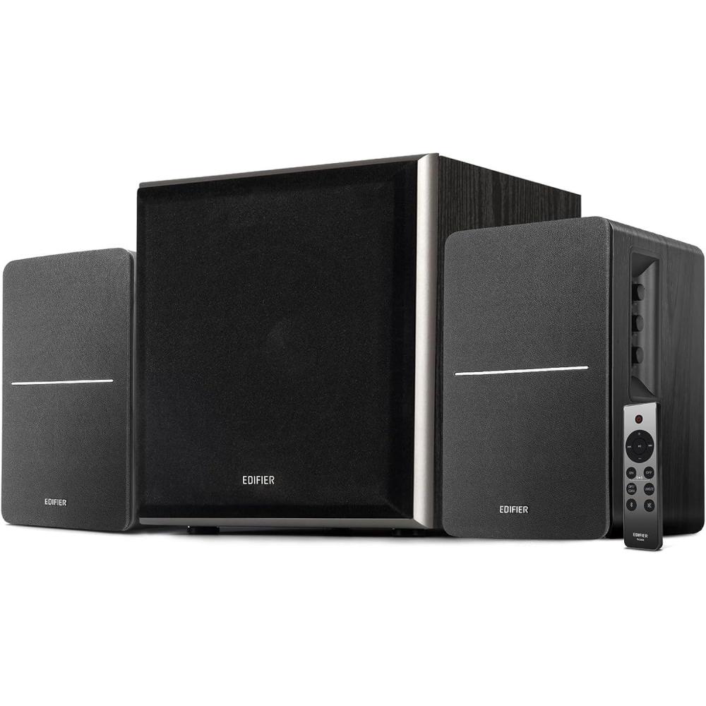 Step up your audio game with the Edifier R1280dbs Active Bluetooth Bookshelf Speakers Paired With The T5 8-Inch Powered Subwoofer Bundle. Experience wireless freedom with Bluetooth 5.0 connectivity, allowing seamless pairing with your smartphone, tablet, or laptop for hassle-free music streaming without the clutter of wires. But the real magic happens when you add the T5 subwoofer to the mix. With its superior sound quality featuring a 4-inch subwoofer unit and 8-inch speaker driver, you'll enjoy powerful, distortion-free bass that elevates your listening experience to new heights. The low pass filter with a frequency response down to 38Hz ensures precise bass reproduction, perfectly complementing the R1280DBs' impressive sound output. Control your audio easily with the updated wireless remote or the side panel controls, adjusting volume, switching input modes, and fine-tuning bass and treble settings with ease. Whether you're streaming music or enjoying movies, this bundle delivers exceptional sound quality and versatility. Elevate your audio setup today and immerse yourself in a world of crystal-clear sound.