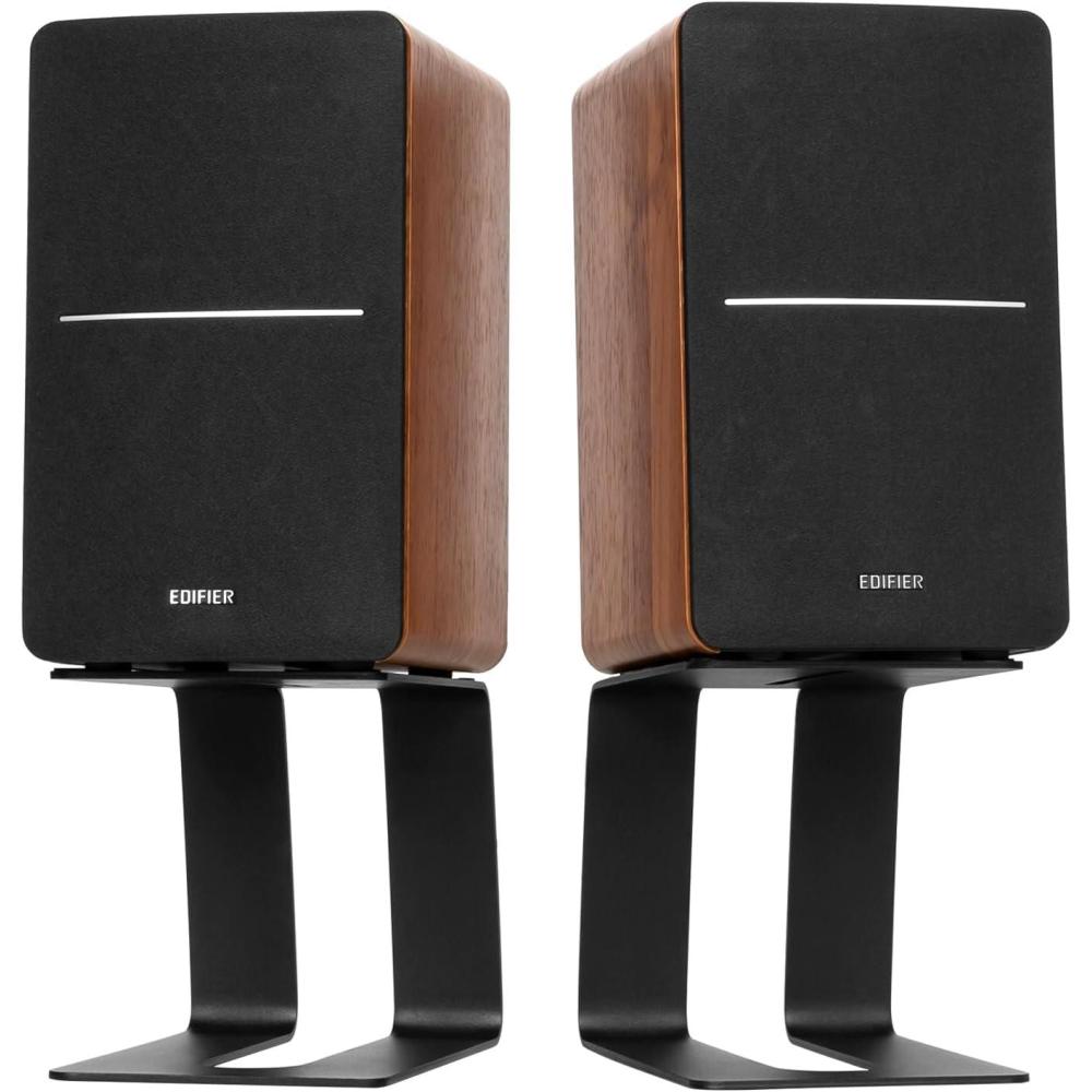 Transform your listening space with the Edifier R1280Ts powered bookshelf speakers and speaker stands combo. This pack pairs the critically acclaimed R1280Ts speakers with specially designed stands to optimize sound quality and reduce vibrations. The speakers offer studio-quality sound with a 42-watt power output, ensuring every note is heard in crystal-clear detail, while the Soundfield Spatializer widens the soundstage for a more lifelike experience. The desktop stands elevate your speakers to ear level, providing a 5-degree tilt that captures the full spectrum of sound. Constructed with heavy-duty materials, these stands ensure your speakers remain stable, even at higher volumes. The non-slip feet prevent movement and reduce vibrations, maintaining the integrity of your audio. Connection is seamless with dual AUX inputs, allowing you to hook up various devices like phones, PCs, and tablets without frequent unplugging. The sub-out port offers the option to connect a subwoofer, further enhancing bass response and depth. Encased in a beautiful wooden enclosure, the speakers not only deliver exceptional sound but also add a touch of elegance to any room. Whether you're enjoying music, movies, or games, this combo pack elevates your audio experience to professional studio levels. Equip your home with this ultimate audio solution and embrace the art of listening. Dimensions (each speaker stands): 15cm/5.9″” X 18cm/7″” X 13cm/5″” X 15.5cm/6″”.