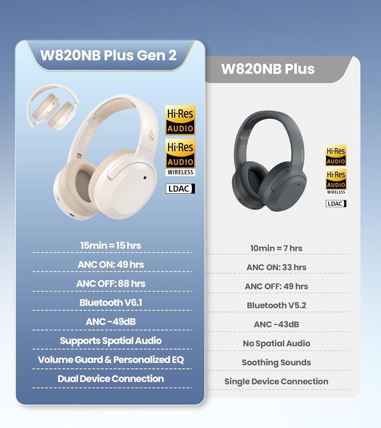 imageEdifier W820NB Plus Gen 2 Wireless OverEar Noise Cancelling Headphone 49 dB ANC LDAC HiRes Audio 88H Playtime Spatial Sound Volume Guard Bluetooth V61 ampamp Multipoint Fast Charge  IvoryNavy